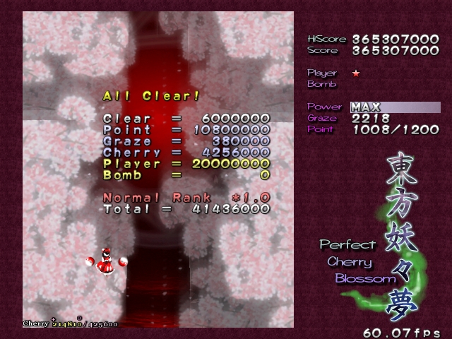 騒霊達で死にまくったときにはもうダメかと思ったけども、奇跡的に妖夢でほとんど死ななかったおかげでなんとかクリアできた。