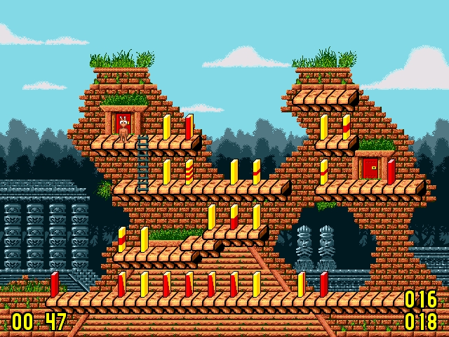 1手で全ての板が倒れるように配置するドミノ倒しなゲーム。